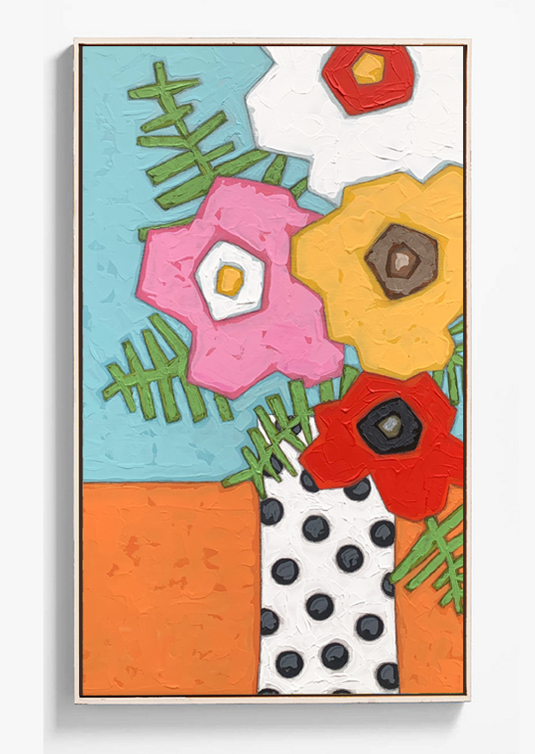 - bouquet | original acrylic + oil pastel in float frame | 15″ x 25″ | $540